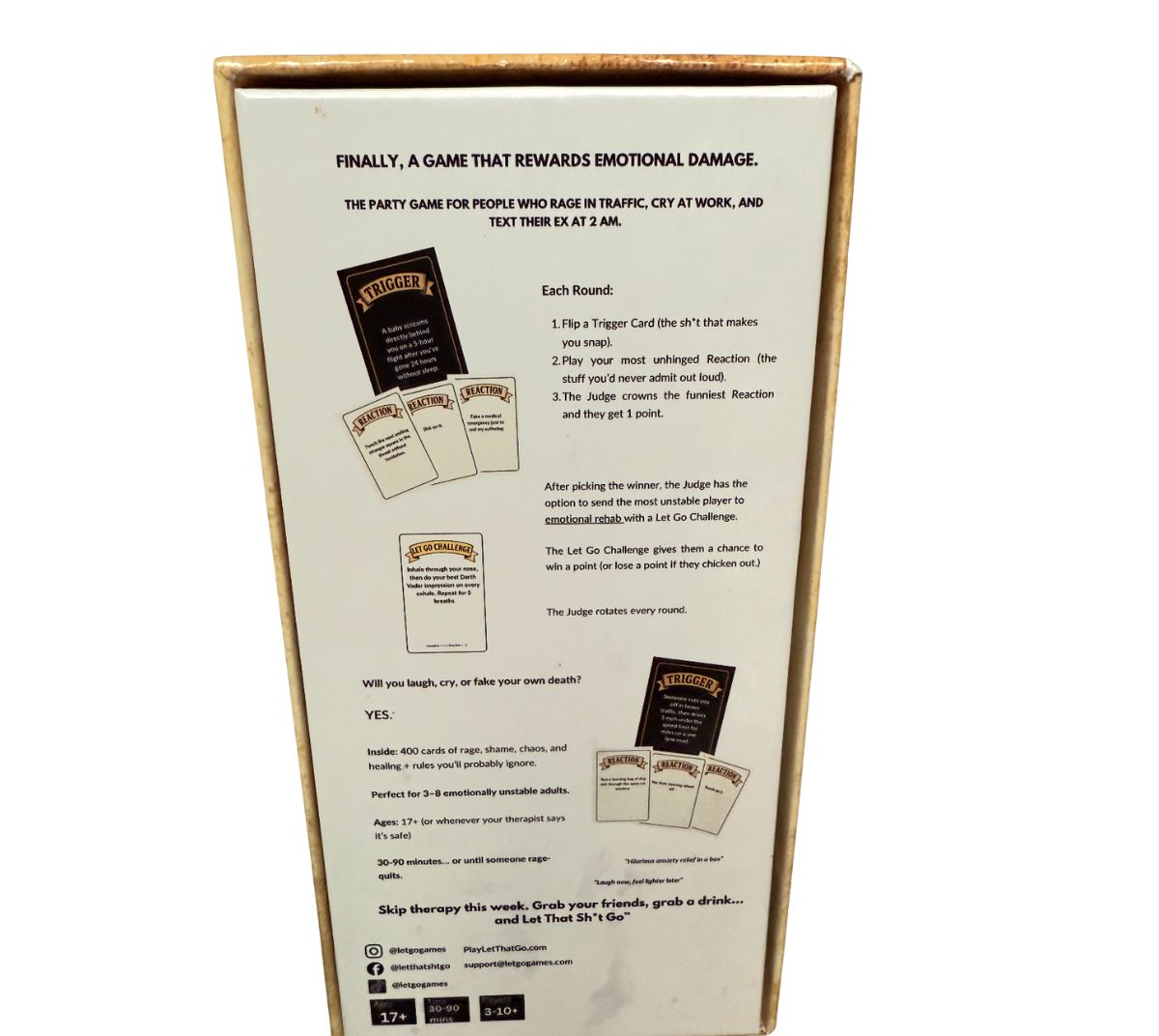 Let That Sh*t Go is like Cards Against Humanity’s slightly unhinged cousin — except instead of just laughing at messed-up answers, you also get to send your friends to therapy. (Don’t worry, it’s the fun kind.)