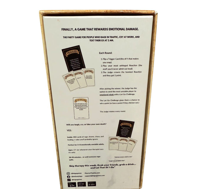 Let That Sh*t Go™ is the NSFW party game where everyday triggers meet unhinged reactions and hilarious “therapy” challenges. Unlike other card games, this one doesn’t just make you laugh—it helps you actually let go of your stress (while roasting your friends).